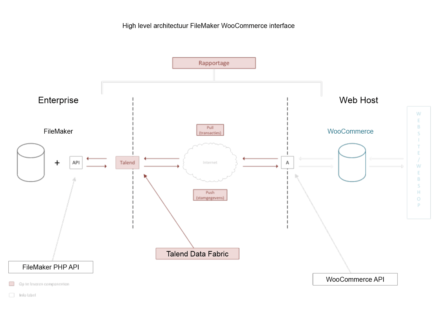 Binnen ons bedrijf willen we graag een gecombineerde b2b / b2c webshop. We denken daarbij aan WooCommerce voor WordPress. Op het b2b gedeelte moeten klanten inloggen en dan krijgen ze bijvoorbeeld de door hen frequent bestelde producten te zien tegen de met hen afgesproken prijzen. De data die de klant te zien krijgt komt rechtstreeks uit FileMaker. Andere zaken die we willen faciliteren zijn het kunnen raadplegen van orderhistorie, facturen en openstaande posten, etc. Wij hebben een partij gevonden die ons denkt te kunnen helpen met het bouwen van de benodigde koppeling. Zij hebben een tekeningetje gemaakt van hoe die koppeling er mogelijk uit zou kunnen zien. Ik heb deze bijgevoegd. Ik ben benieuwd of er mensen zijn op dit forum die zich wel eens met dergelijke vraagstukken bezig houden en zo ja, wat die van de voorgestelde opzet vinden.