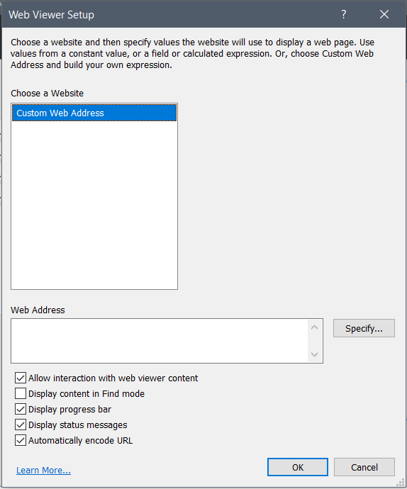 Ik loop tegen het probleem aan dat wanneer ik een web viewer wil installeren, dat ik hier alleen maar een custom web address kan aanmaken. Al de velden die normaal rechts van het keuzescherm zitten zijn verdwenen. (Google, Google maps e.d.). Ik heb FileMaker al een keer opnieuw geïnstalleerd (en toen werkte alles weer, alle keuzemogelijkheden waren weer aanwezig) maar na een paar dagen is de web viewer weer eigenwijs en kan ik alleen dus een "custom web address" invoeren. Oh ja, ik werk op een Windows machine. Weet iemand hier een blijvende oplossing voor, zodat ik niet telkens FileMaker opnieuw moet installeren? Alvast bedankt voor het meedenken.