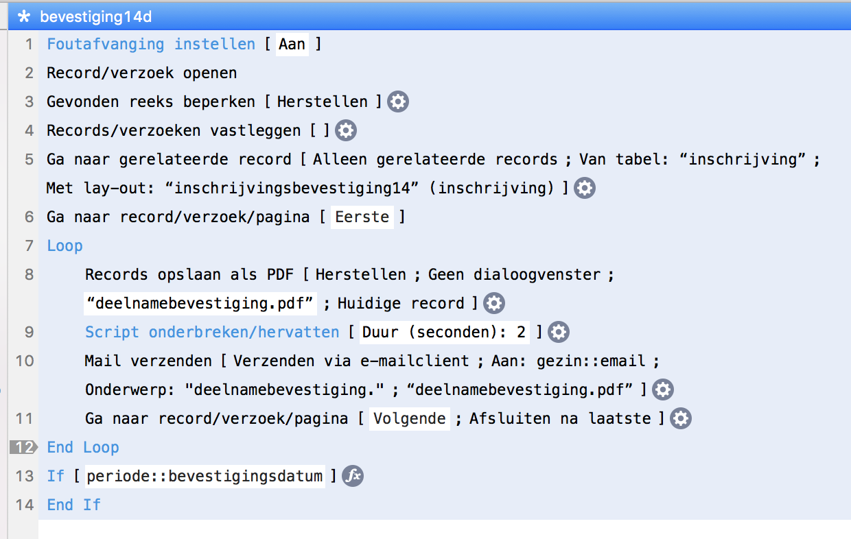 0 Banach Posted March 24, 2018 Posted March 24, 2018 (edited) Hier moet wat anders aan de hand zijn. Stap 9 en volgende worden namelijk pas uitgevoerd wanneer stap 8 klaar is. Je kunt de werking checken door het script in debug mode stap voor stap door te lopen (daar heb je dan wel FileMaker Advanced voor nodig). Verander je script anders eens door het volle pad naar de pdf in een variable op te slaan: Dat zou toch moeten werken Edited March 24, 2018 by Banach Quote