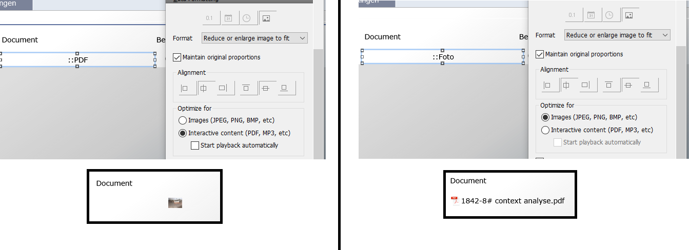 1 Banach Posted April 10, 2018 Posted April 10, 2018 (edited) 1 hour ago, Leen said: Is dit iets van FileMaker of doe ik iets niet goed? Ja en nee. In de eerste plaats denk ik dat in jouw bijlages de onderdeeltjes met een rouwrandje zijn verwisseld, maar dat terzijde. Wanneer je een document als file (bestand) in de container importeert dan krijg je het icoon ervan samen met de bestandsnaam te zien. Dit geldt voor zowel een plaatje als een pdf in om het even een container geoptimaliseerd voor plaatje dan wel een voor pdf. Voeg je een plaatje als plaatje (afbeelding) in dan krijg je een voorvertoning ervan. Zelfs wanneer je een pdf kiest. Wanneer je altijd het icoon met de bestandsnaam wilt zien moet je het document dus invoegen als file. Edited April 10, 2018 by Banach Quote