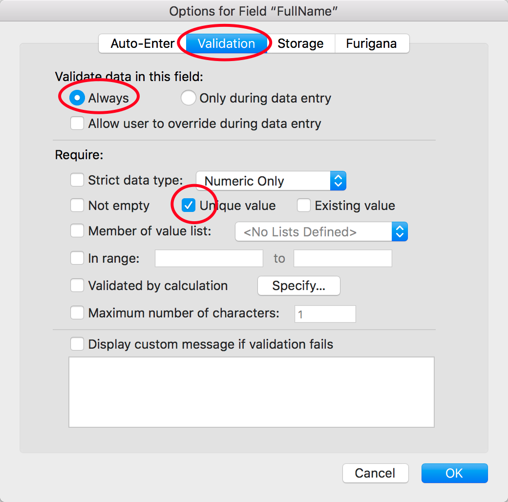 Ik zou echter graag gewoon willen dat als ik een naam toevoeg (First Name en Last Name) en deze al bestaat in "Contacts" dat Filemaker mij deze naam niet laat toevoegen en dat daarbij de nieuwe "ID" die gepaard gaat met het creëren van een nieuw "contact" ook dan niet gebruikt.